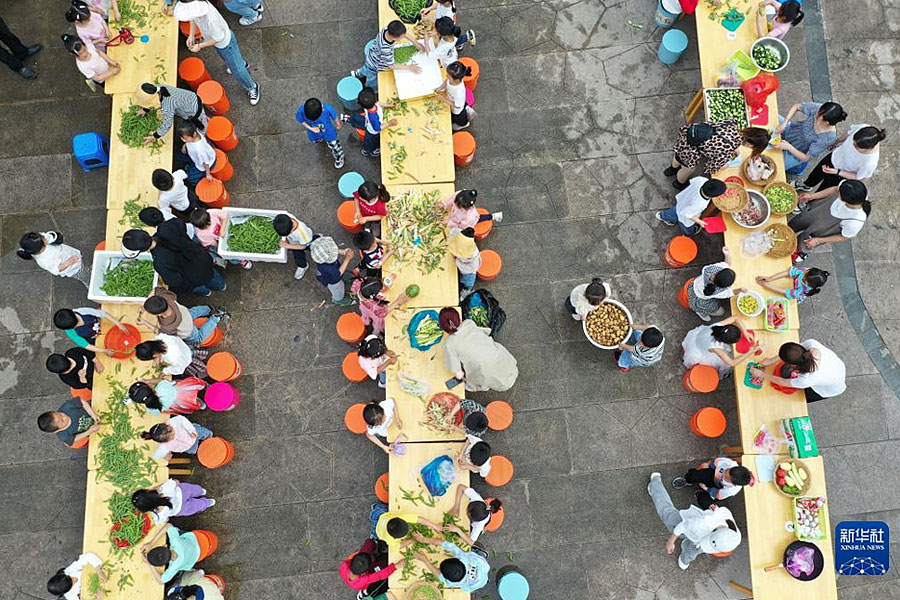 1/05月5日,浙江省湖州市德清縣乾元鎮(zhèn)第二幼兒園的孩子和老師在整理燒立夏飯的食材(無(wú)人機(jī)照片)。(新華社發(fā) 倪立芳/攝)