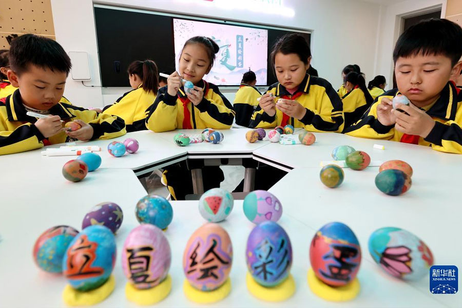 1/05月5日,浙江省臺(tái)州市仙居縣中心幼兒園的小朋友在老師的指導(dǎo)下繪立夏彩蛋。(新華社發(fā) 王華斌/攝)