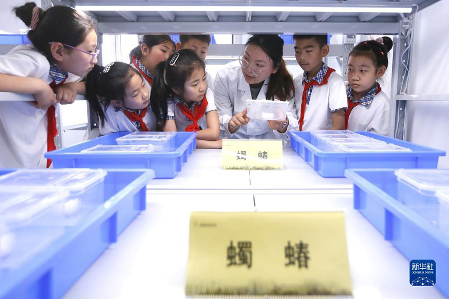 1/05月22日,小學(xué)生在中國農(nóng)業(yè)科學(xué)院青島特種作物研究中心試驗(yàn)基地學(xué)習(xí)昆蟲知識(shí)。(新華社發(fā) 梁孝鵬/攝)