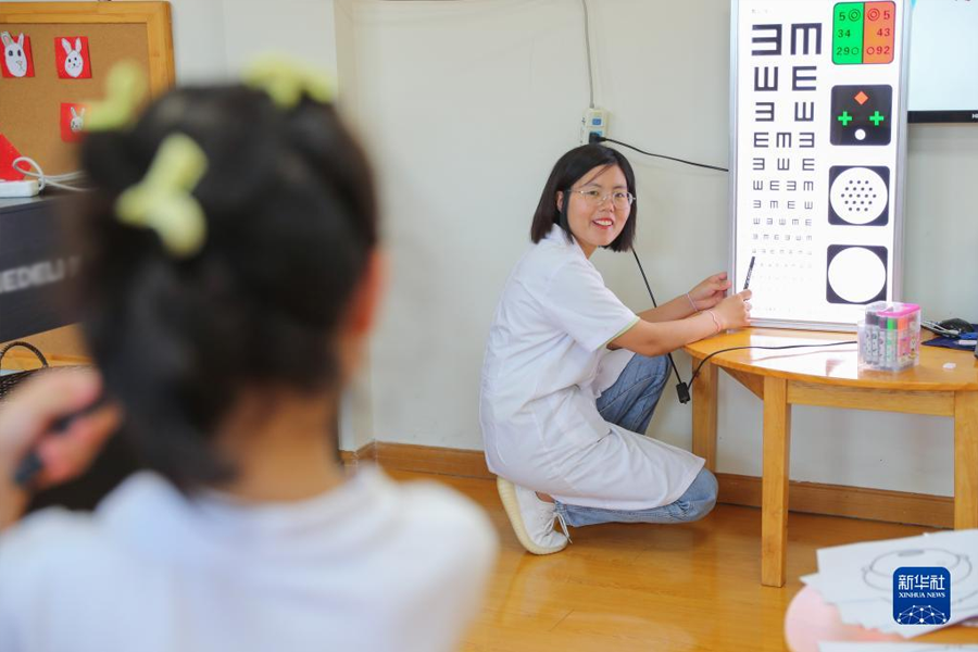 1/06月5日,在浙江省湖州市德清縣武康街道伊頓幼兒園里,眼科醫(yī)生在給小朋友檢查視力。(新華社發(fā) 蔡俊/攝)