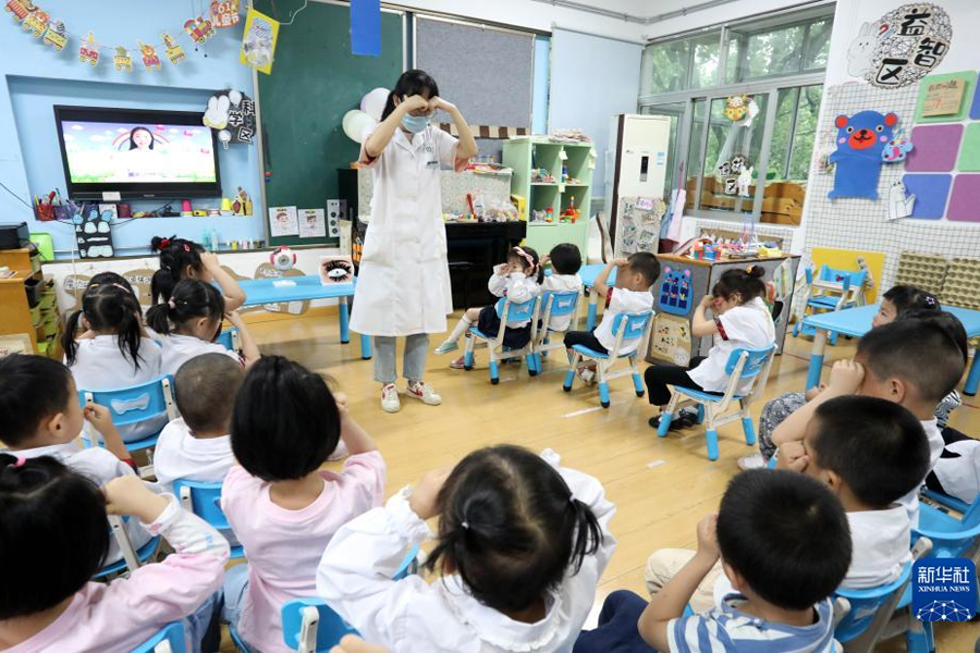 1/06月5日,江蘇省蘇州市姑蘇區(qū)金閶街道彩香一村社區(qū)衛(wèi)生服務(wù)中心醫(yī)務(wù)人員指導(dǎo)彩香村幼兒園小朋友做眼保健操。(新華社發(fā) 杭興微/攝)