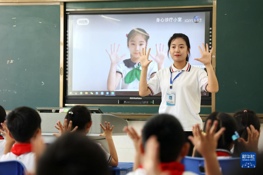 1/06月5日,在山東省濱州市渤海中學(xué)南校區(qū),老師指導(dǎo)小學(xué)生做無(wú)接觸式眼保健操。(新華社發(fā) 初寶瑞/攝)