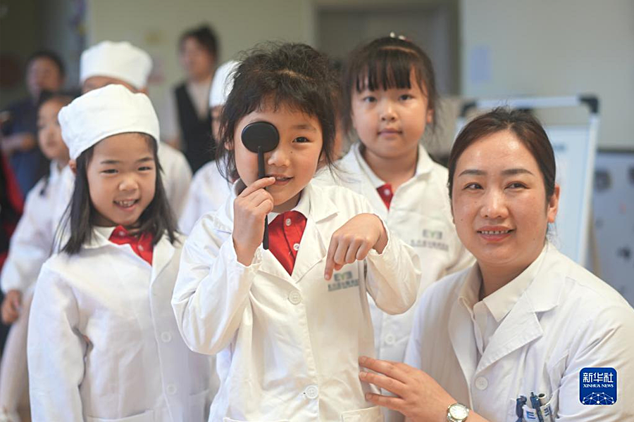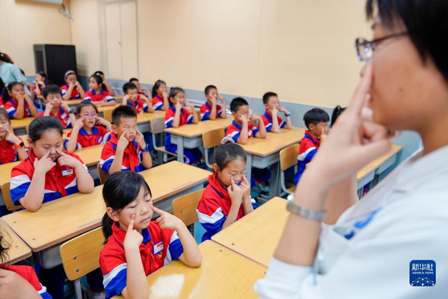1/06月5日,在河北省秦皇島市山海關(guān)區(qū)南園小學(xué),秦皇島市工人醫(yī)院五官科醫(yī)務(wù)人員帶領(lǐng)學(xué)生們做眼保健操。(新華社發(fā) 郭楠/攝)