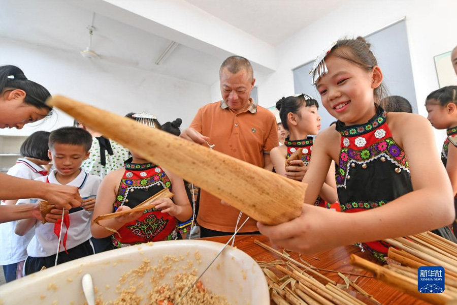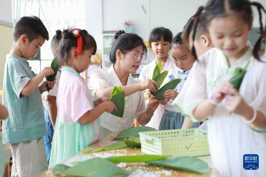 1/06月20日,在貴州省黔東南苗族侗族自治州岑鞏縣第二幼兒園,老師在教小朋友包粽子。(新華社發(fā) 羅慧/攝)