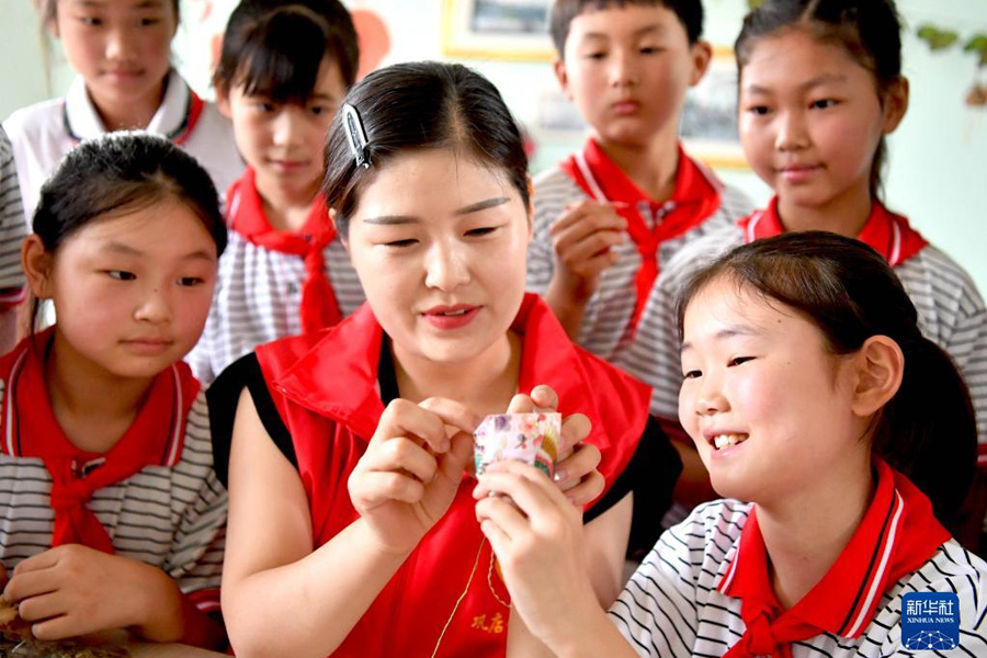 1/06月20日,在安徽省亳州市利辛縣鞏店鎮(zhèn)鄉(xiāng)村少年宮,志愿者在教孩子們學(xué)做香囊。(新華社發(fā) 劉勤利/攝)