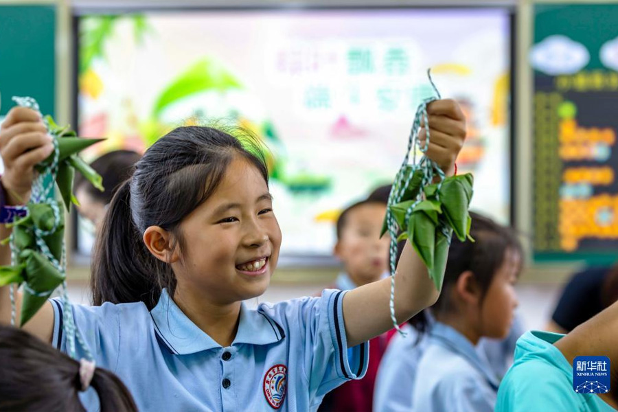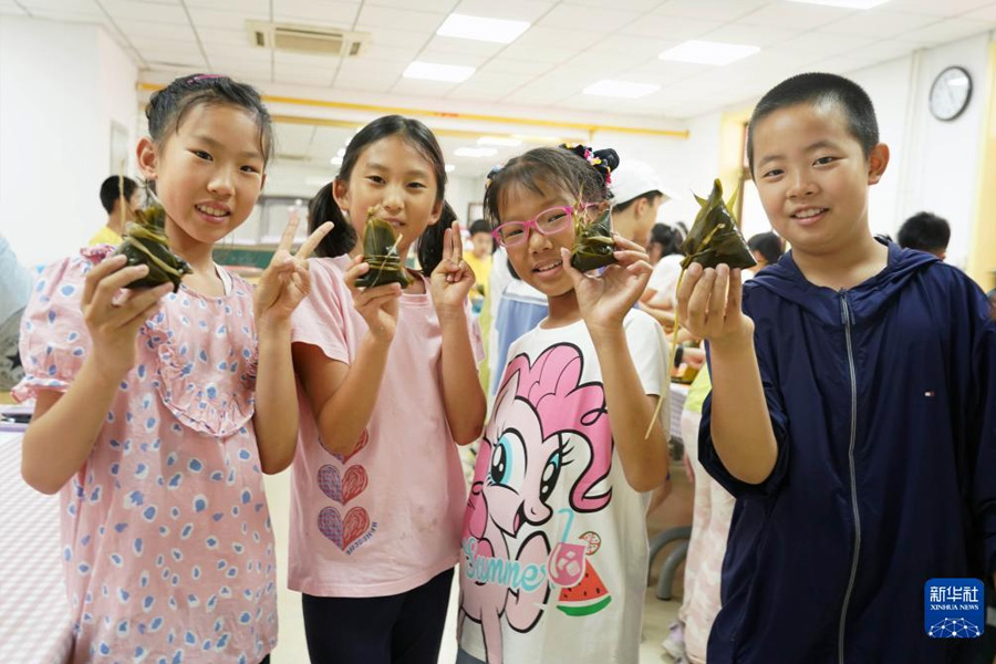1/06月20日,在位于北京的人大附中實驗小學(xué),學(xué)生在廚藝課上包粽子。(新華社記者 任超/攝)