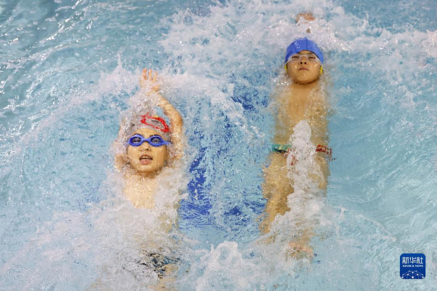 1/07月21日,學(xué)生在山東省棗莊市一家游泳館內(nèi)練習(xí)游泳。(新華社發(fā) 孫中喆/攝)