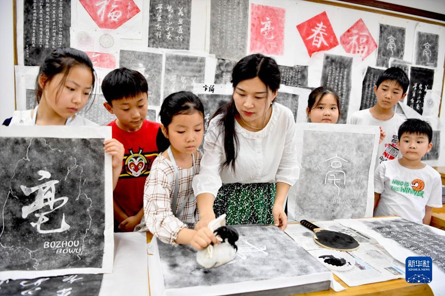 1/07月20日,在安徽省亳州市文化館,孩子們?cè)诶蠋煹闹笇?dǎo)下學(xué)習(xí)拓片技藝。(新華社發(fā) 劉勤利/攝)