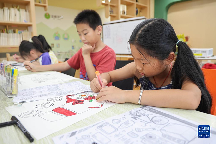 1/07月21日,在山東省臨沂市蘭山區(qū)銀雀山街道東苗莊社區(qū)暑假托管班,孩子們?cè)趯W(xué)習(xí)繪畫。(新華社發(fā) 許傳寶/攝)