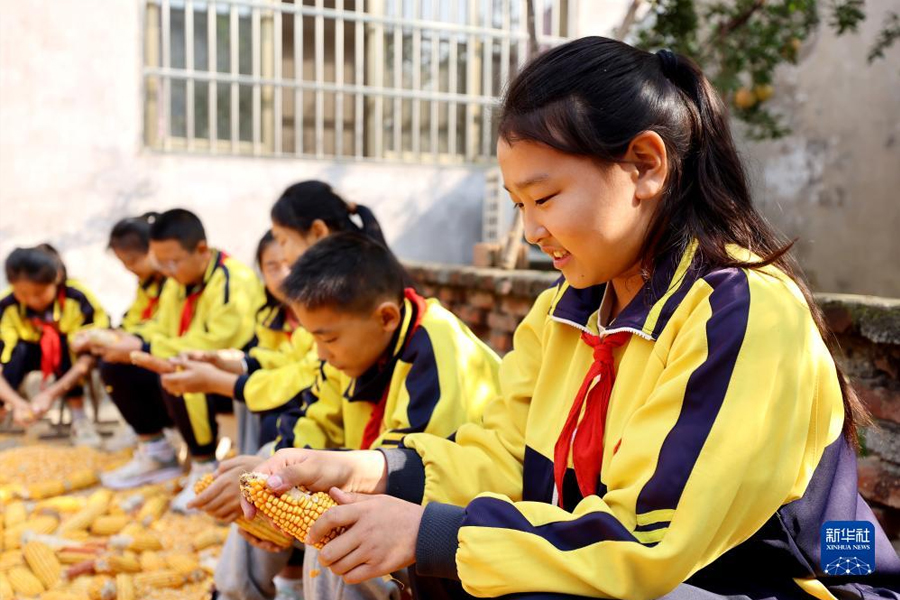 1/010月16日,山東省棗莊市東山陰小學(xué)學(xué)生在農(nóng)家小院幫農(nóng)民搓玉米。(新華社發(fā) 孫中喆/攝)
