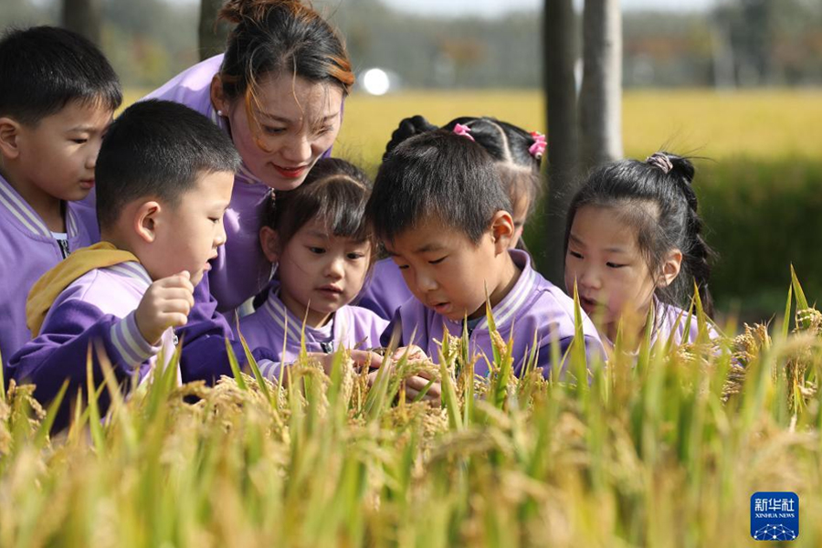 1/010月16日,浙江省臺(tái)州市路橋區(qū)橫街鎮(zhèn)紅蘋(píng)果幼兒園的小朋友在老師的帶領(lǐng)下走進(jìn)田間,認(rèn)識(shí)糧食。(新華社發(fā) 蔣友青/攝)