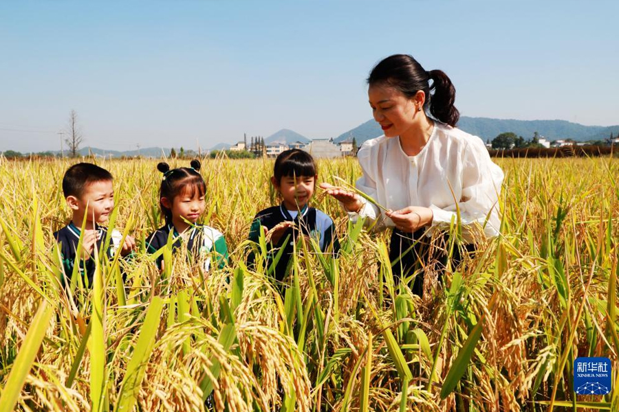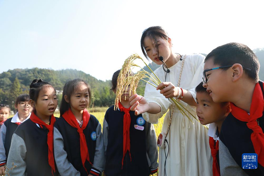 1/010月16日,浙江省杭州市臨安區(qū)天目山鎮(zhèn)藻溪小學(xué)學(xué)生在老師的帶領(lǐng)下學(xué)習(xí)水稻知識(shí)。(新華社發(fā) 胡劍歡/攝)