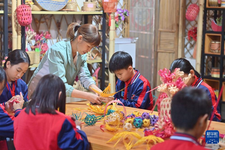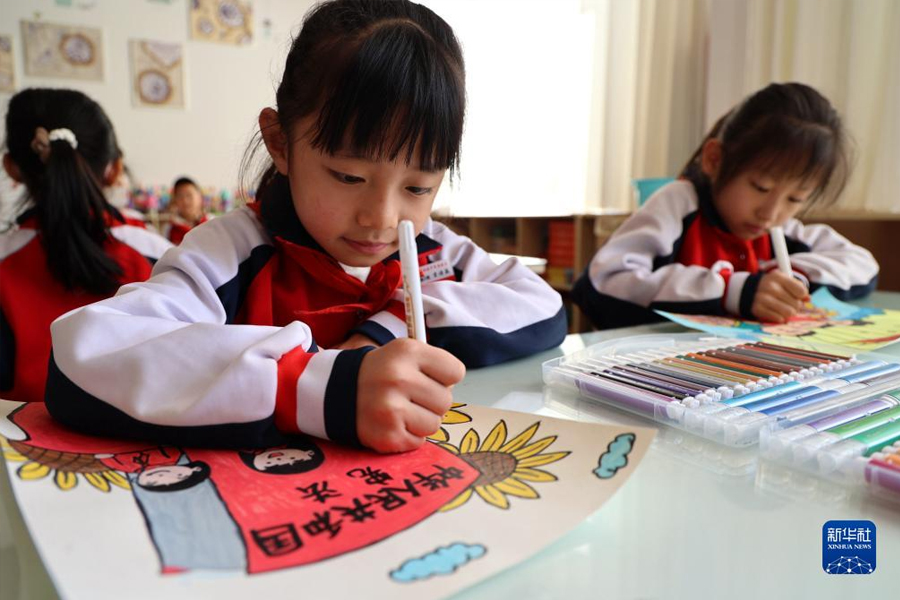 1/012月4日,山東省濱州市渤海中學小學部的學生在繪制以國家憲法日為主題的手抄報。(新華社發(fā) 初寶瑞/攝)