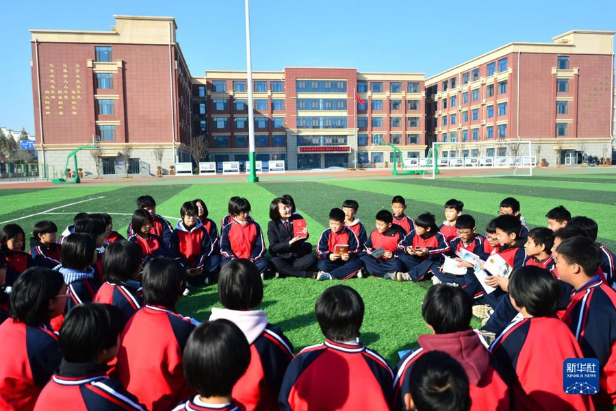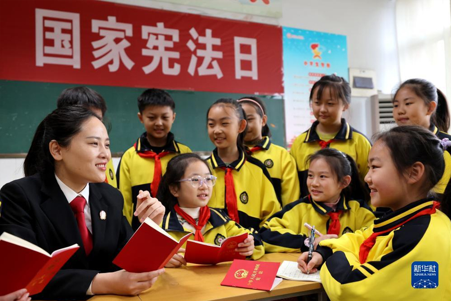 1/012月4日,在河北省邢臺市內(nèi)丘縣實驗小學,檢察院工作人員與學生互動學習憲法知識。(新華社發(fā) 劉繼東/攝)