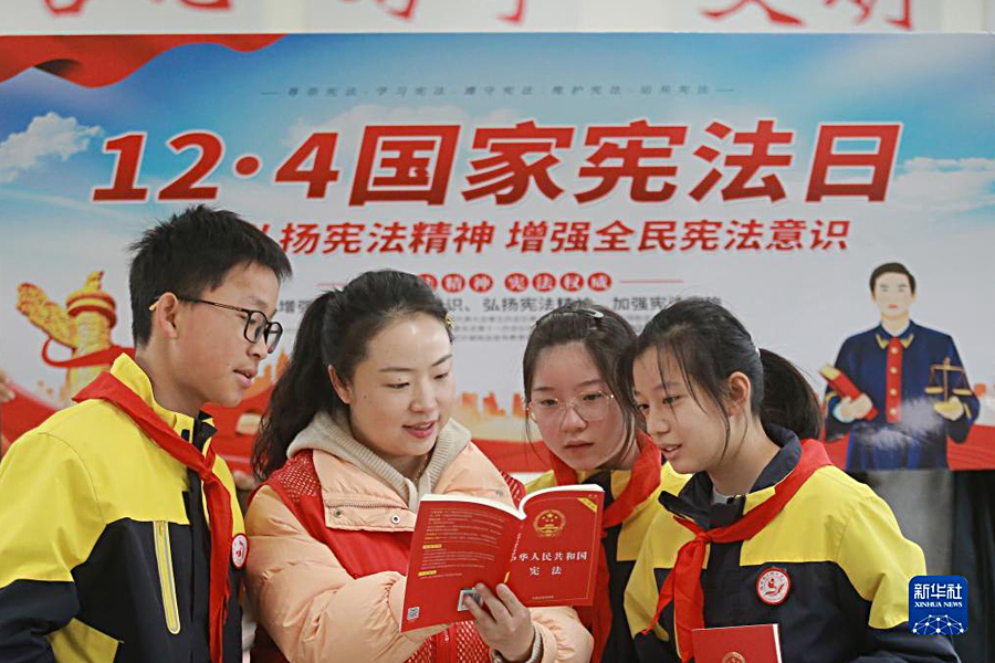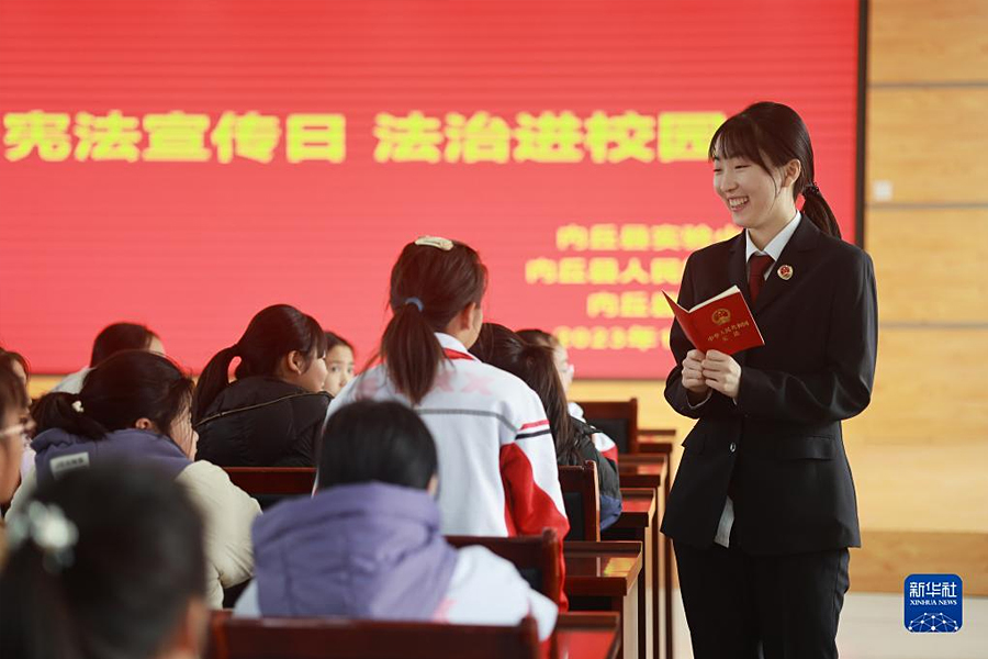 1/012月4日,在河北省邯鄲市成安縣第七中學東城校區(qū),成安縣檢察院工作人員給學生講解憲法知識。當日是第十個國家憲法日,各地舉辦多種形式的活動弘揚憲法精神,提升公民法治素養(yǎng)。(新華社記者 王曉/攝)