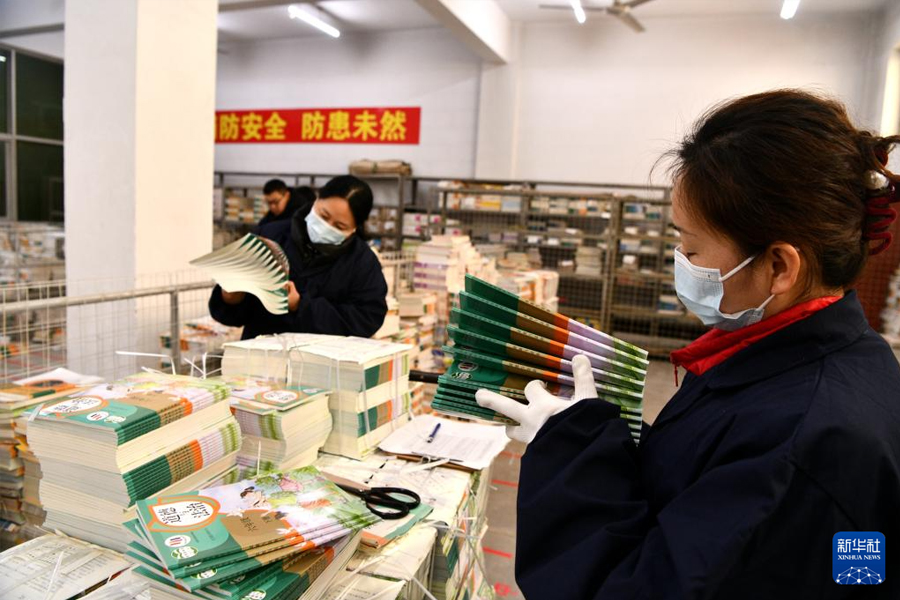 1/02月22日,工作人員在河北省石家莊新樂市新華書店倉庫整理中小學(xué)教材,準(zhǔn)備送往各學(xué)校。(新華社發(fā) 賈敏杰/攝)