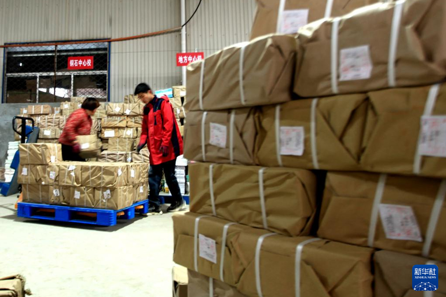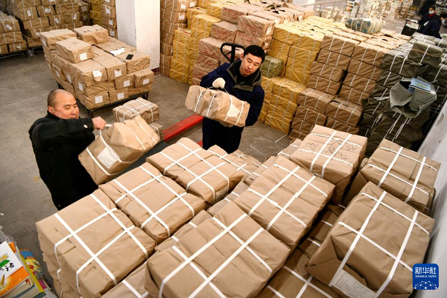1/02月21日,在山東省臨沂市平邑縣新華書店倉庫,工作人員在搬運(yùn)教材。(新華社發(fā) 武紀(jì)全/攝)