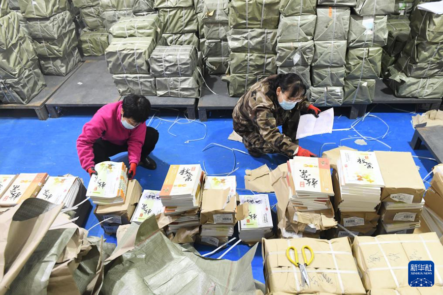 1/02月22日,在河北省石家莊市欒城區(qū)新華書店,工作人員在分類清點(diǎn)、分發(fā)、配送新學(xué)期教材。(新華社發(fā) 李明發(fā)/攝)