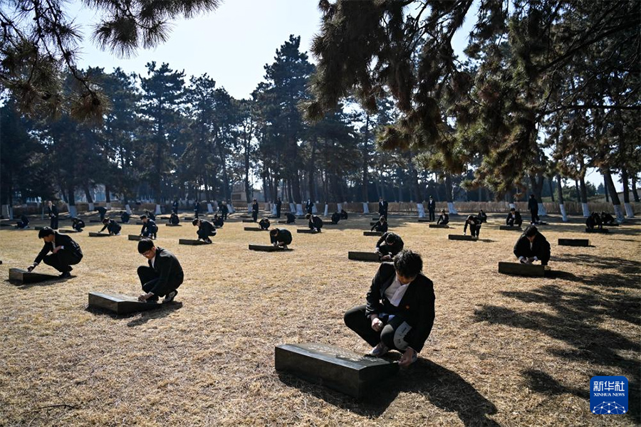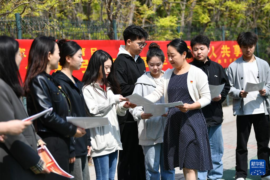 1/04月12日,在河北邯鄲學(xué)院校園內(nèi),教師和在校大學(xué)生一起學(xué)習(xí)全民國家安全教育相關(guān)知識(shí)。(新華社發(fā) 胡清華/攝)