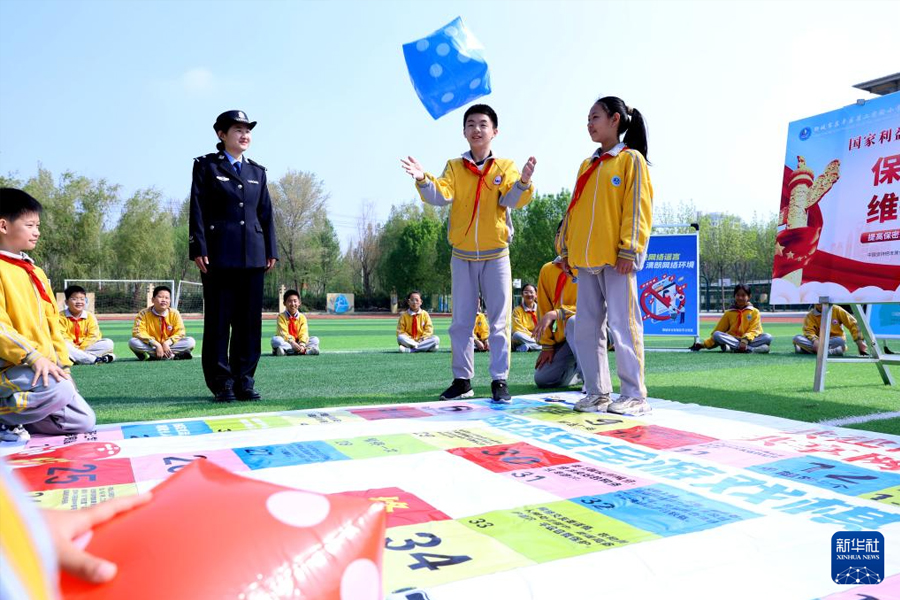 1/04月12日,在山東省聊城市茌平區(qū)第二實(shí)驗(yàn)小學(xué),學(xué)生在民警的指導(dǎo)下參與國家安全主題的飛行棋闖關(guān)比賽。(新華社發(fā) 馬紅坤/攝)