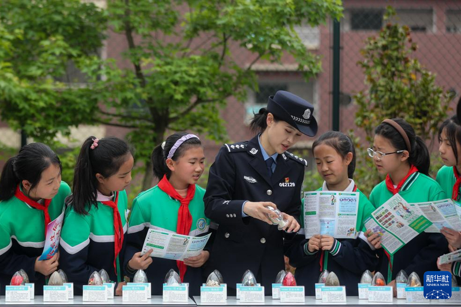 1/04月12日,民警在貴州省貴陽市烏當(dāng)區(qū)實(shí)驗(yàn)小學(xué)禁毒園地為學(xué)生講解禁毒知識(shí)。(新華社發(fā) 袁福洪/攝)