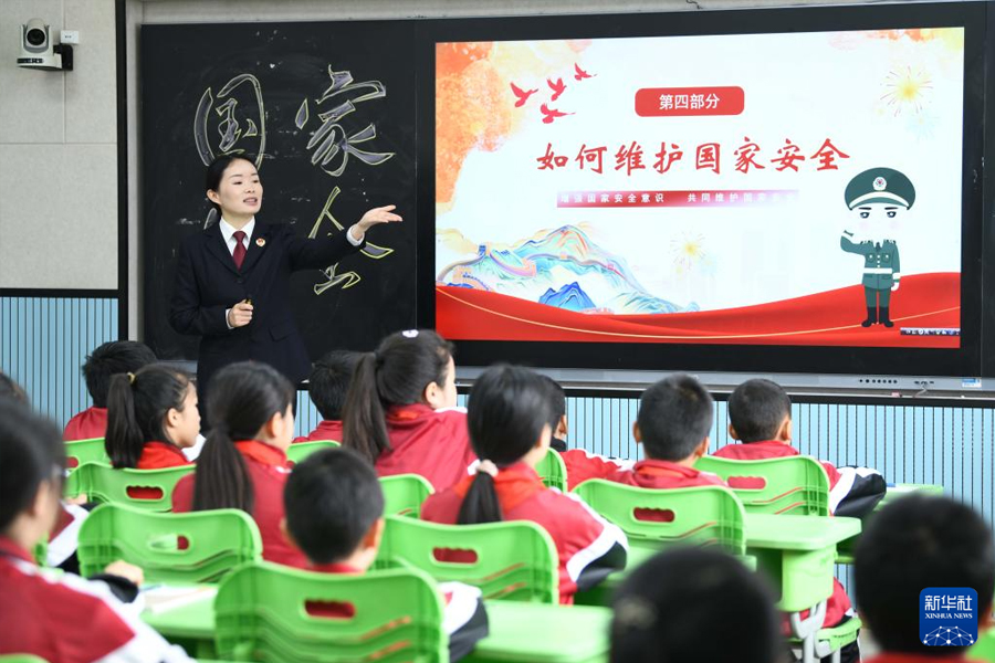 1/04月12日,山東省棗莊市市中區(qū)人民法院法官在東湖小學(xué)給學(xué)生們講解國家安全相關(guān)法律法規(guī)知識(shí)。全民國家安全教育日臨近,各地學(xué)校通過多種方式向?qū)W生普及國家安全相關(guān)法律法規(guī)知識(shí),增強(qiáng)學(xué)生們對(duì)總體國家安全觀的認(rèn)識(shí),共筑國家安全防線。(新華社發(fā) 孫中喆/攝)