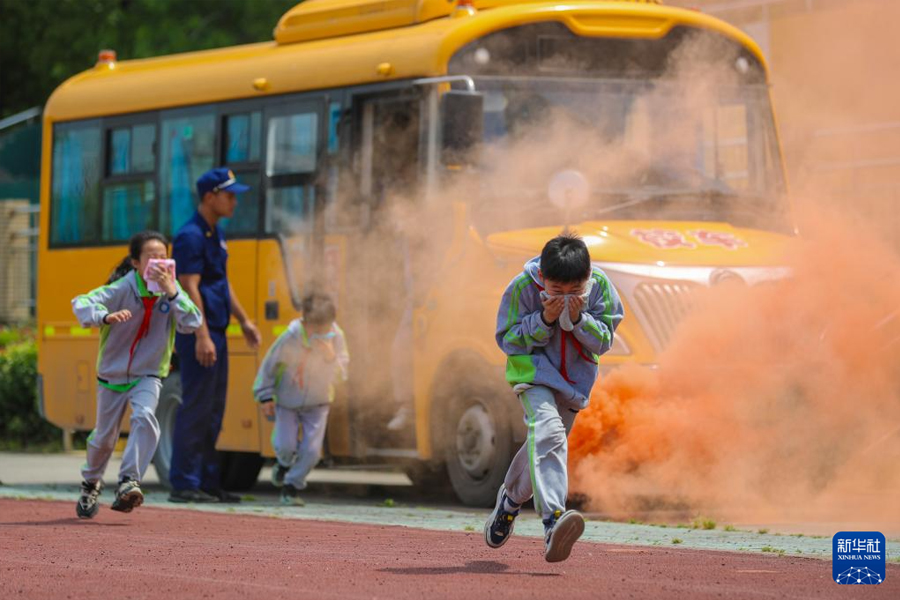 1/05月9日,浙江省湖州市德清縣鐘管小學(xué)學(xué)生在消防員指導(dǎo)下進(jìn)行校車逃生演練。(新華社發(fā) 王正/攝)