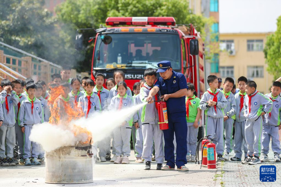 1/05月9日,浙江省湖州市德清縣鐘管小學(xué)學(xué)生在消防員指導(dǎo)下學(xué)習(xí)滅火器滅火。(新華社發(fā) 王正/攝)