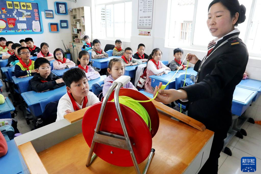 1/05月9日,在江蘇省蘇州市胥江中心小學(xué)校,蘇州軌道交通2號(hào)線盤蠡路區(qū)域微型消防站隊(duì)員向?qū)W生講解救生照明線的功能。(新華社發(fā) 杭興微/攝)