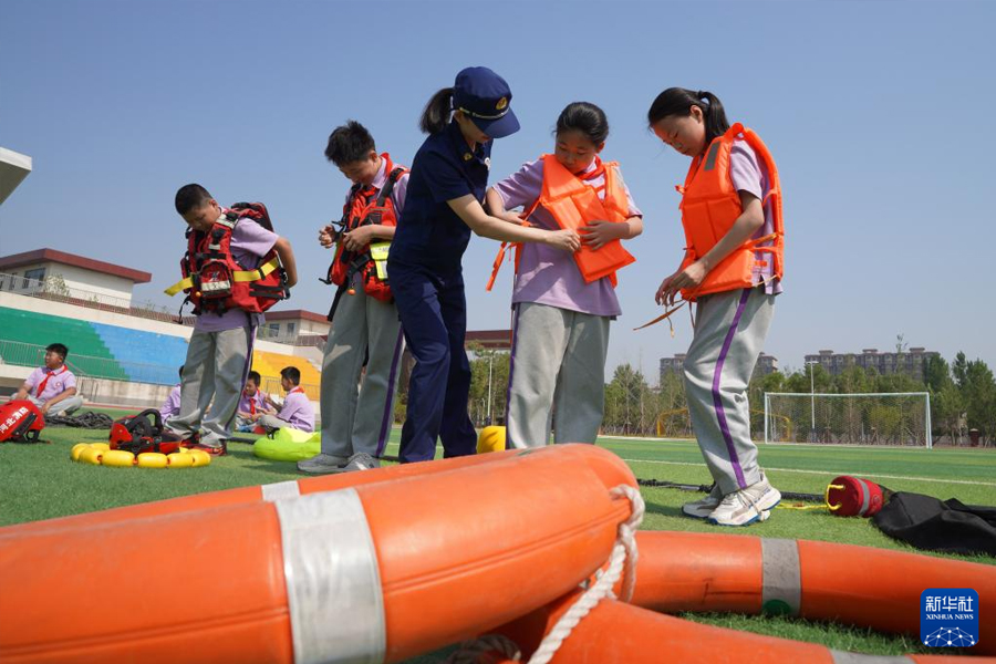 1/05月9日,在河北省邢臺(tái)市內(nèi)丘縣朝陽小學(xué),消防救援大隊(duì)工作人員指導(dǎo)學(xué)生穿戴救生衣。(新華社發(fā) 劉繼東/攝)