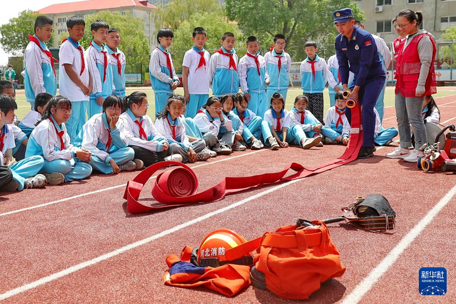 1/05月9日,河北省秦皇島市海港區(qū)消防救援大隊(duì)消防員為海港區(qū)燕秀里小學(xué)學(xué)生普及消防安全知識(shí)。(新華社發(fā) 曹建雄/攝)