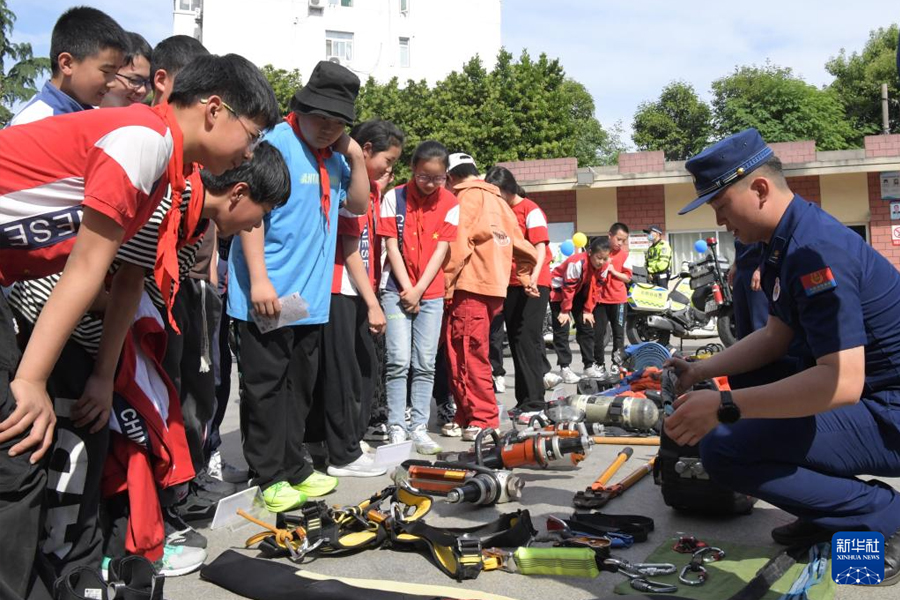 1/05月9日,安徽省合肥市蜀山區(qū)“平安建設(shè)校園行”活動(dòng)在樂農(nóng)新村小學(xué)奧林校區(qū)啟動(dòng),蜀山區(qū)消防救援大隊(duì)消防員向?qū)W生介紹救援器械。(新華社發(fā) 陳三虎/攝)