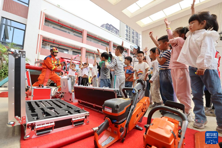 1/05月9日,在福建省廈門市翔安教育集團(tuán)濱海幼兒園,翔安區(qū)消防救援大隊(duì)消防員向孩子介紹消防器材裝備的使用方法。(新華社發(fā) 曾德猛/攝)