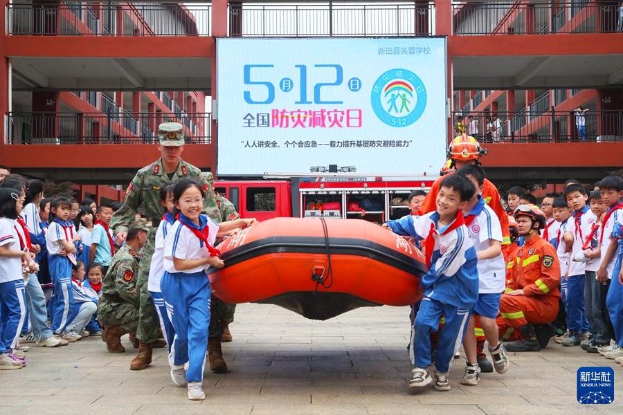 1/05月9日,在湖南省永州市新田縣芙蓉學(xué)校,學(xué)生在學(xué)習(xí)救援皮劃艇的使用。(新華社發(fā) 劉貴雄/攝)
