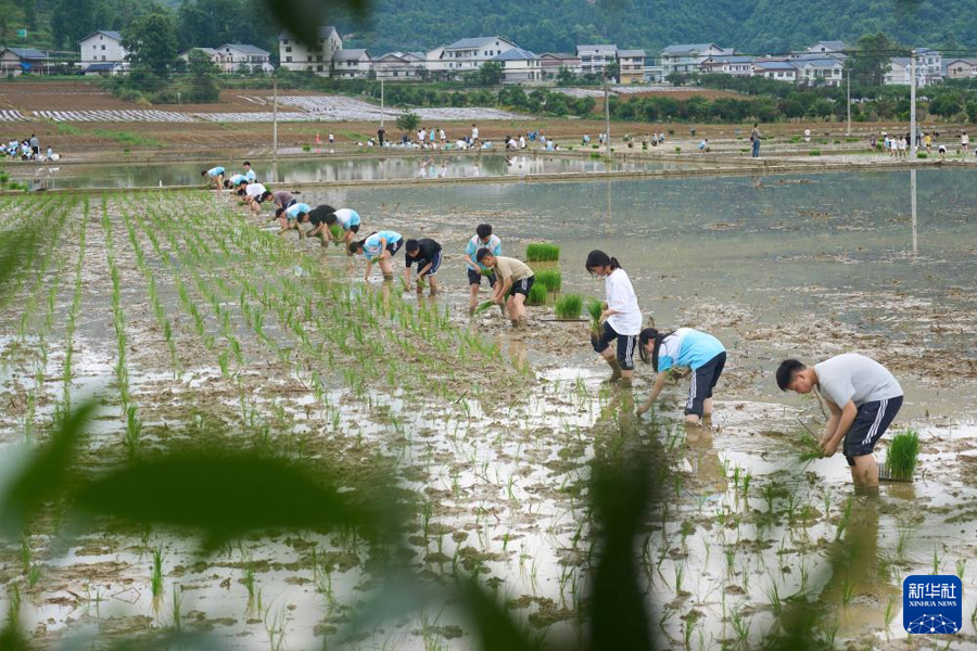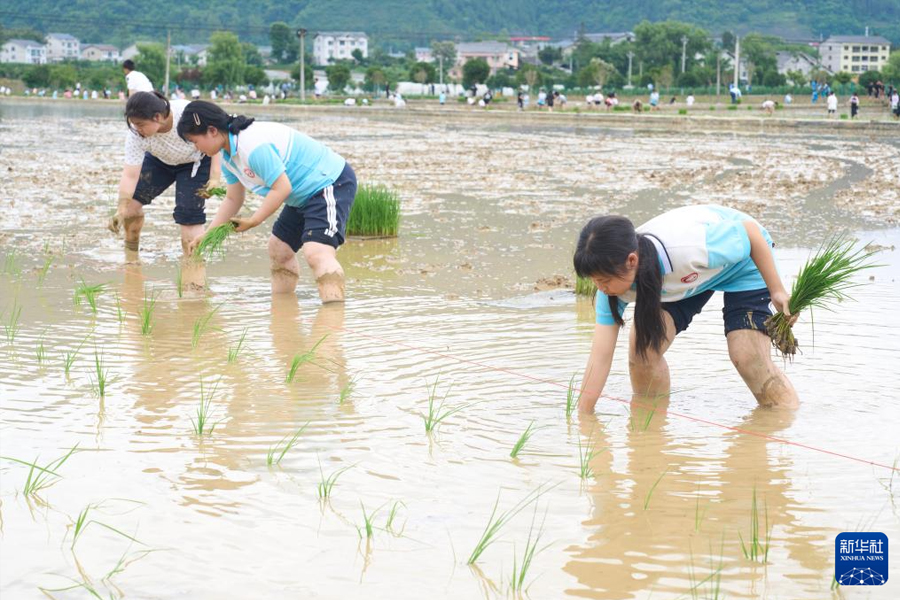 5月21日,貴州省綏陽縣旺草中學的學生在稻田里開展插秧勞動。貴州省綏陽縣旺草中學將課堂搬到田間地頭,讓學生們通過農事體驗,深刻體會“粒粒皆辛苦”的意義與內涵,感受勞動之美。(新華社發(fā) 李前勇/攝)