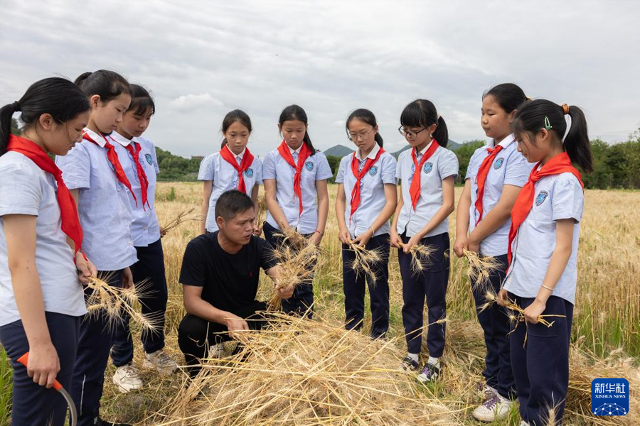 5月21日,浙江省諸暨市姚江鎮(zhèn)江藻小學的學生在體驗收割麥子。當日,浙江省諸暨市姚江鎮(zhèn)江藻小學的學生來到梓尚閣村,在麥田里開展勞動實踐課,學生們在田間跟隨農民學習、體驗收割麥子,學習農耕知識,感受勞動的艱辛與快樂。(新華社發(fā) 郭斌/攝)