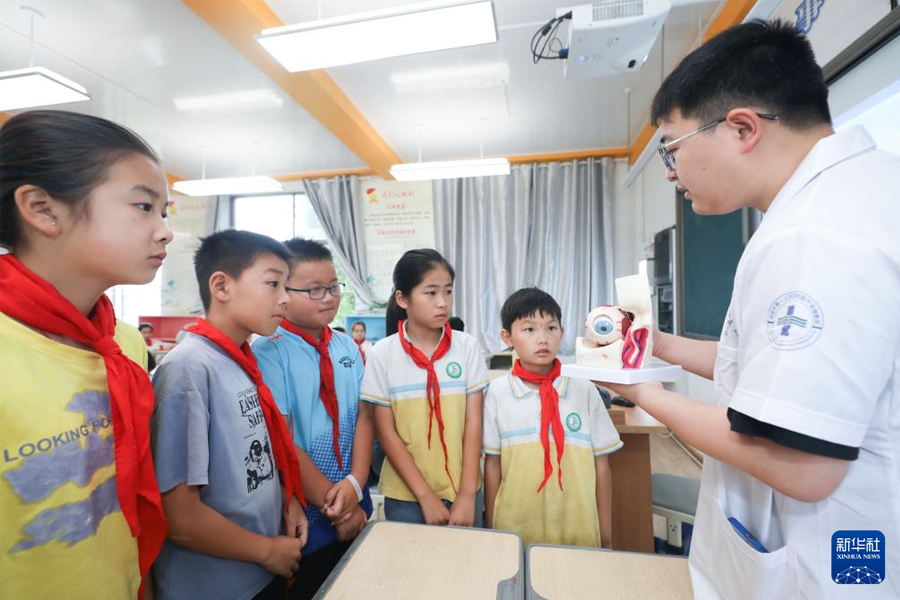1/06月7日,在云南開遠(yuǎn)市考點,送考老師身著寓意“開門紅”的紅色T恤為同學(xué)們加油。(新華社發(fā) 陶家淇/攝)