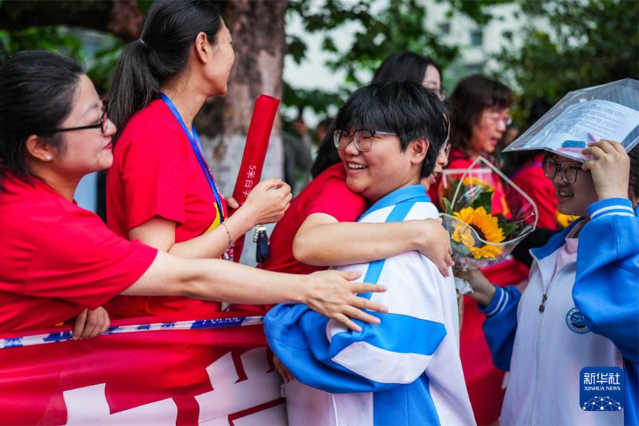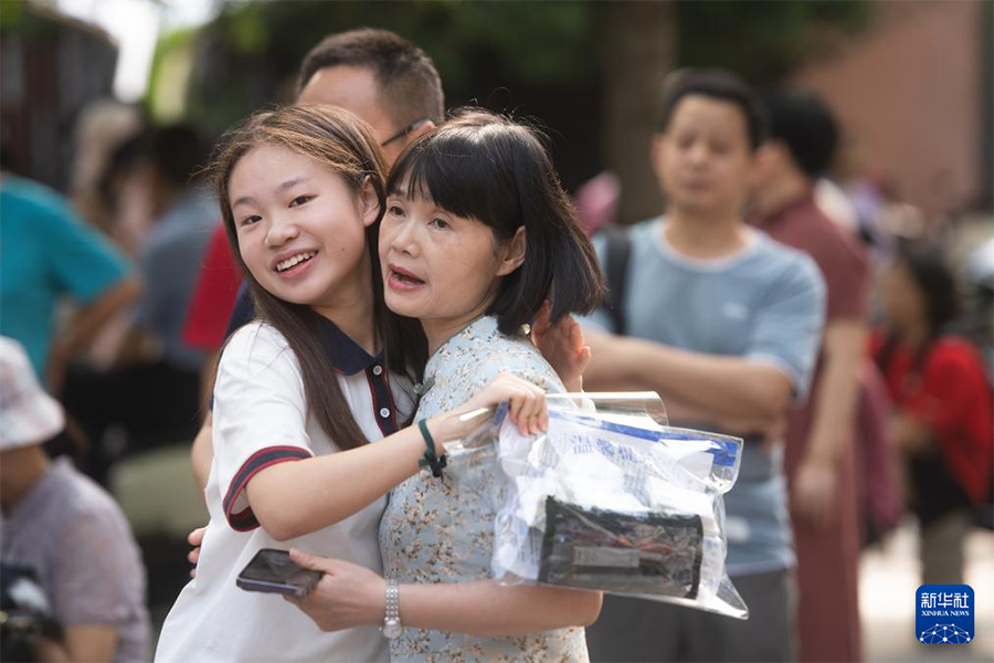 1/06月7日,在湖北省武漢市第十四中學(xué)考點,一名考生與送考家長擁抱。(新華社記者 伍志尊/攝)