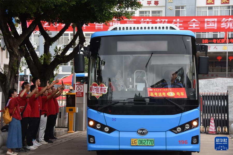 1/06月7日,在云南省紅河哈尼族彝族自治州蒙自市第一高級中學(xué)(文科)考點,老師為學(xué)生加油打氣,愛心送考車送考生到紅河州第一中學(xué)(理科)考點參加高考。(新華社發(fā) 薛瑩瑩/攝)