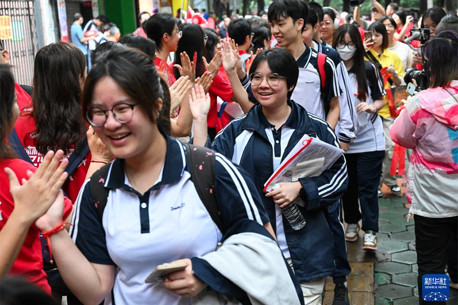 1/06月7日,考生在廣東省廣州市鐵一中學(xué)考點與送考老師擊掌。(新華社記者 劉大偉/攝)