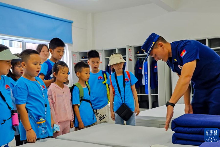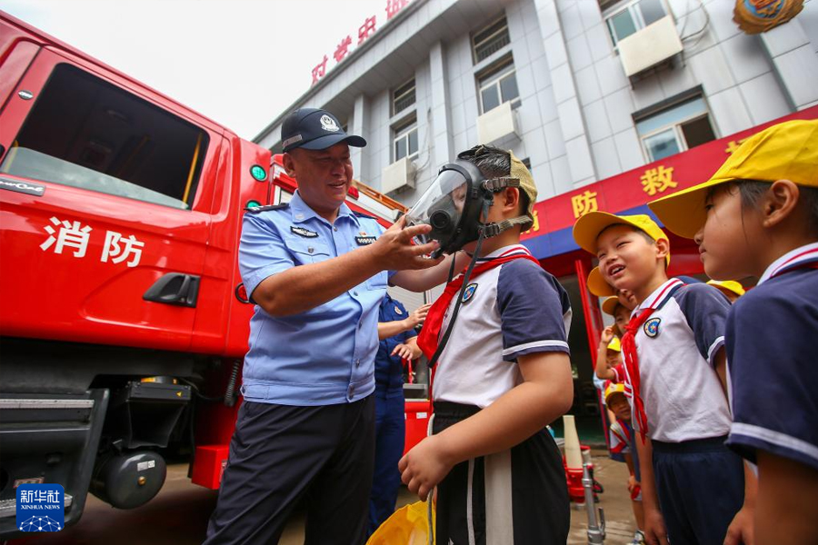 7月16日,在山東省濟南市市中區(qū)英雄山路消防增援站,來自玉函小學的學生體驗消防裝備。(新華社發(fā) 郝鑫城/攝)