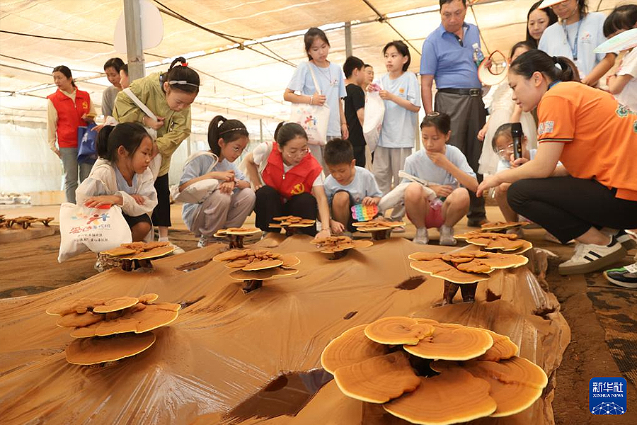 7月16日,江蘇省南通市崇川區(qū)幸福街道“小候鳥”愛心暑托班學生在一家生物科技園的蕈菌園參觀赤靈芝。(新華社發(fā) 許叢軍/攝)