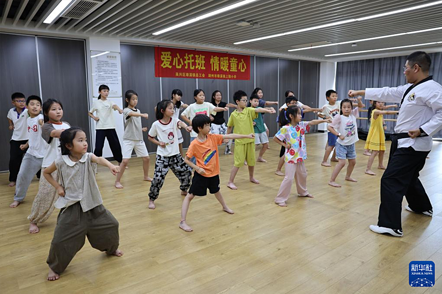7月16日,在浙江省湖州市吳興區(qū)埭溪鎮(zhèn)總工會、上強小學、埭溪鎮(zhèn)志愿者聯(lián)合會舉辦的愛心暑托班上,公益講師帶領小朋友一起練習跆拳道。(新華社記者 黃宗治/攝)