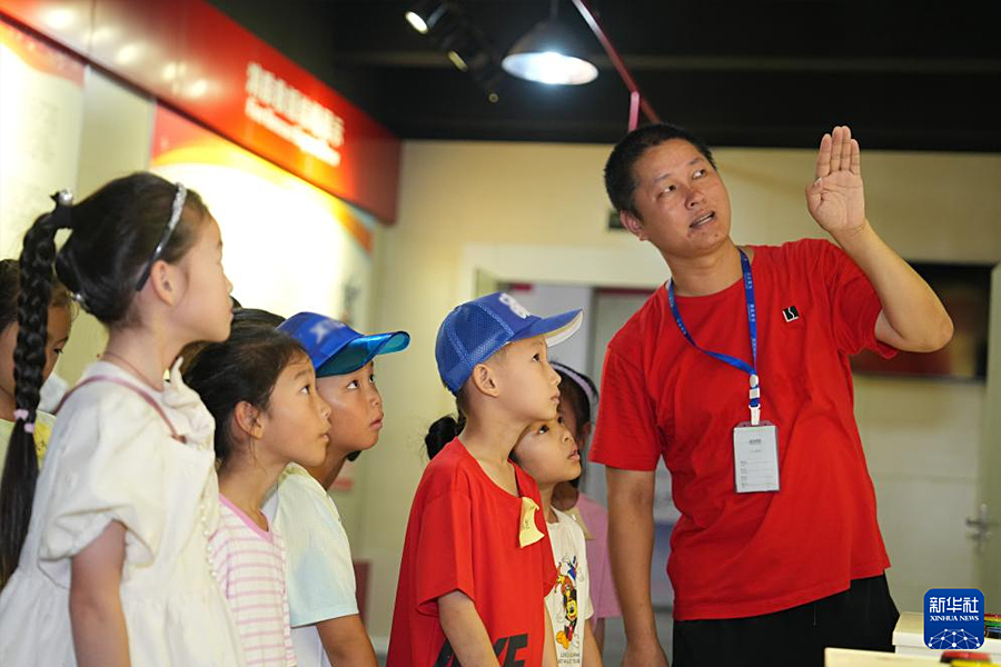 7月16日,在重慶市北碚區(qū)水土街道萬壽社區(qū)消防體驗室,工作人員給孩子們講解消防應急救援知識。(新華社發(fā) 秦廷富/攝)