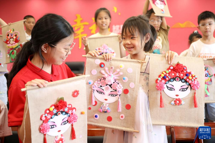 7月15日,在浙江省杭州市桐廬縣鳳川街道黨群服務中心,志愿者和小朋友展示制作的臉譜掛畫。(新華社發(fā) 徐軍勇/攝)