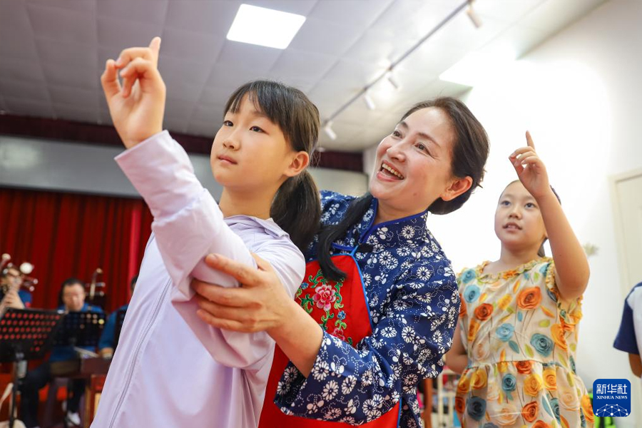 7月15日,在山東省青島市李滄區(qū)樓山街道翠湖社區(qū)新時代文明實踐站,呂劇老師指導孩子學習呂劇基本動作。(新華社發(fā) 張鷹/攝)