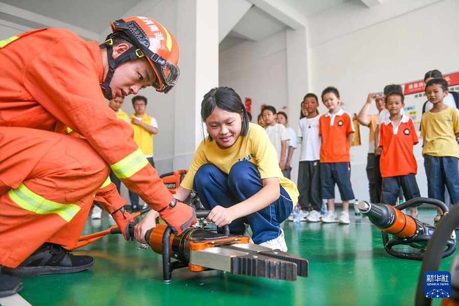 7月16日,在湖南省永州市道縣道州北路消防救援站,小朋友體驗消防裝備的操作使用。(新華社發(fā) 蔣克青/攝)