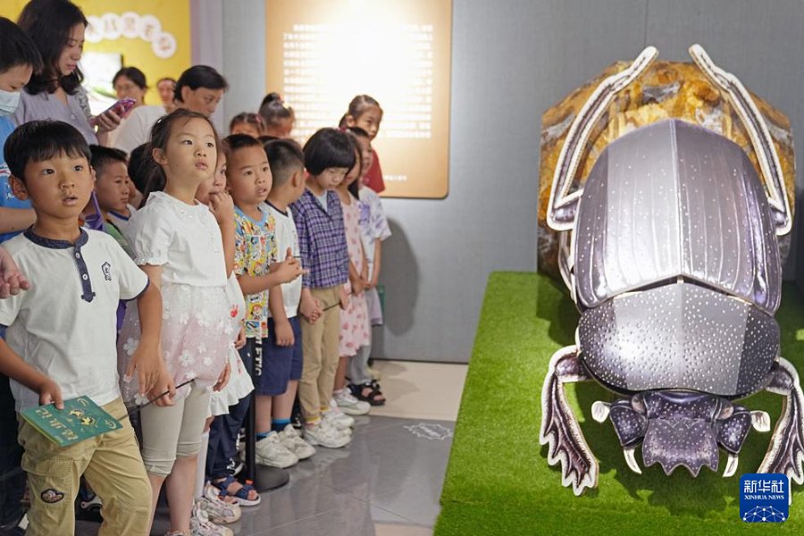 7月16日,在上海市群眾藝術館的“走進藝術之門”系列活動中,孩子們參觀昆蟲互動體驗展。(新華社記者 劉穎/攝)