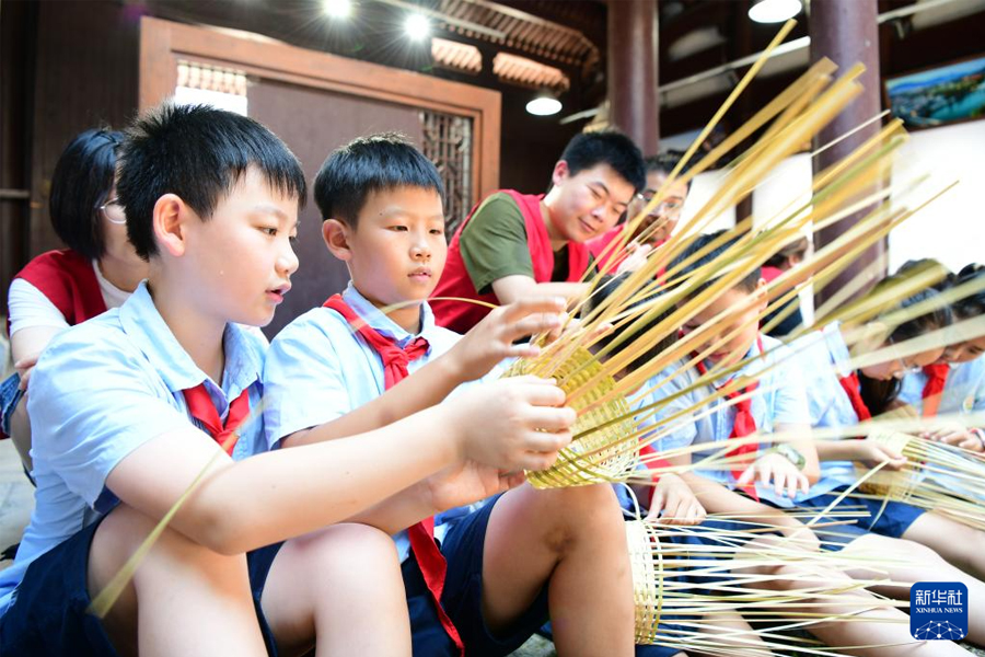 1/08月3日,在江蘇省興化市圖書館,學(xué)生在黨員志愿者的指導(dǎo)下體驗活字印刷。暑假期間,各地少年兒童參加形式多樣的活動,樂享充實快樂的假期生活。(新華社發(fā) 周社根/攝)