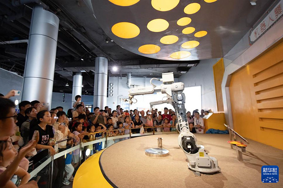 1/08月3日,小朋友在家長陪同下在江蘇省科技館觀看機(jī)器人表演。(新華社發(fā) 楊素平/攝)
